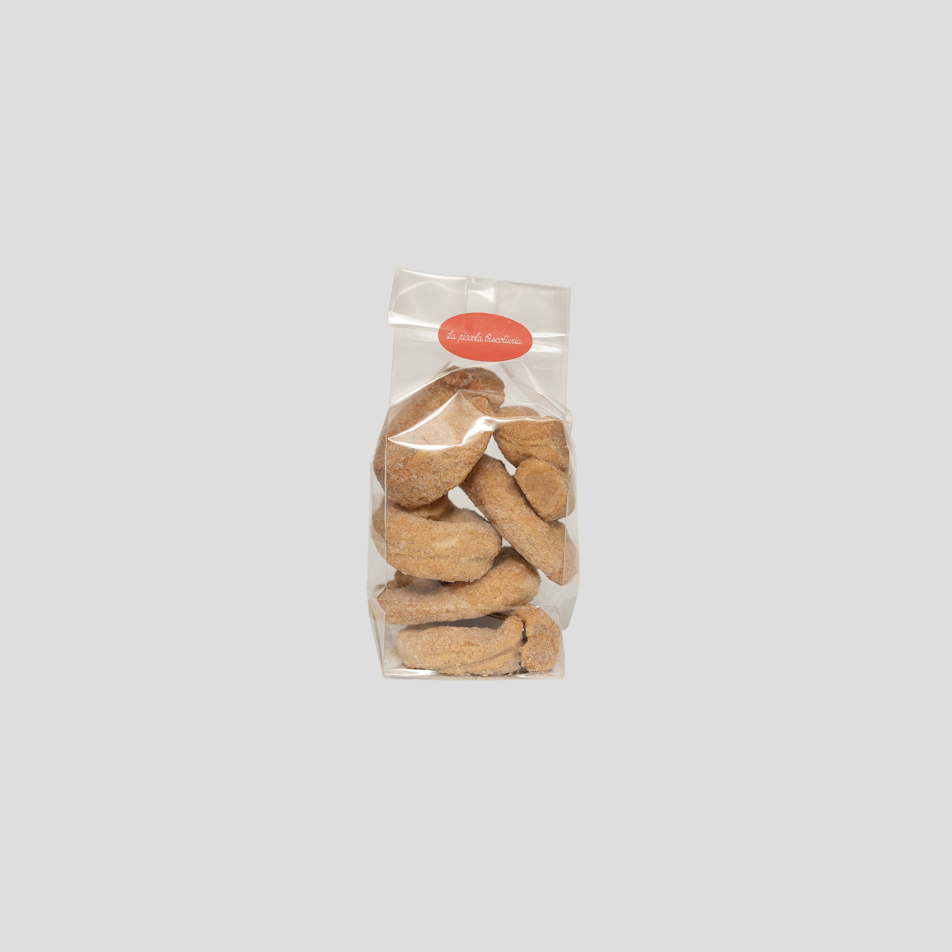 Ingredienti: farina di GRANO TENERO tipo 2 GRANI ANTICHI, VINO bianco, olio di semi di girasole, olio extravergine di oliva, sale, zenzero (3%), cannella (3%), zucchero, bicarbonato di sodio.
